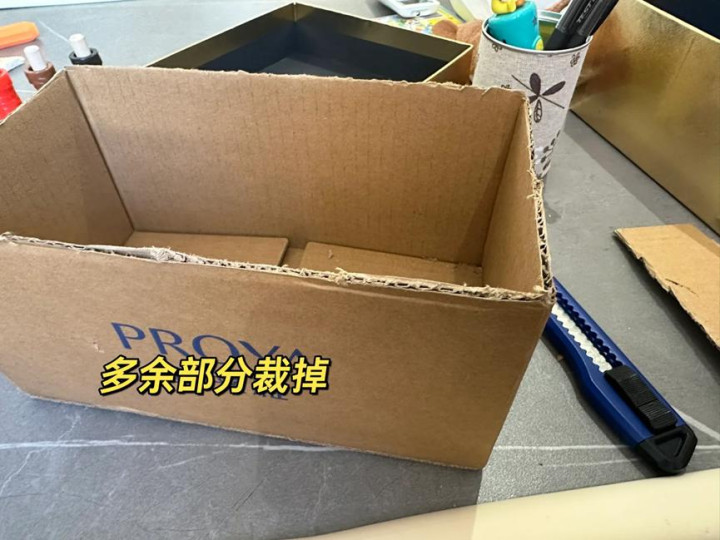纸箱先准备好,把上面多余的部分剪裁掉。