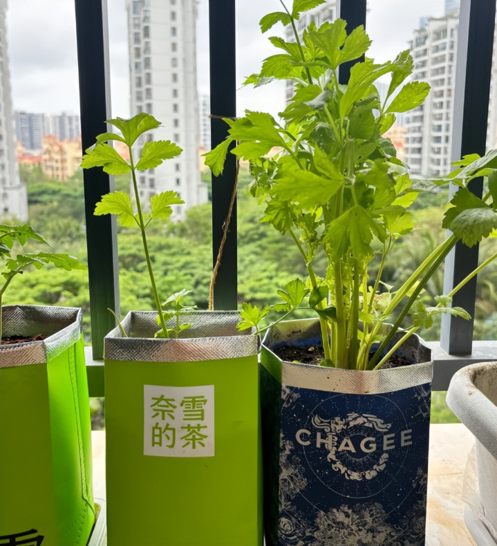 只需要用奶茶袋子,奶茶袋子折叠一下,放点土,这不就可以种菜了吗?