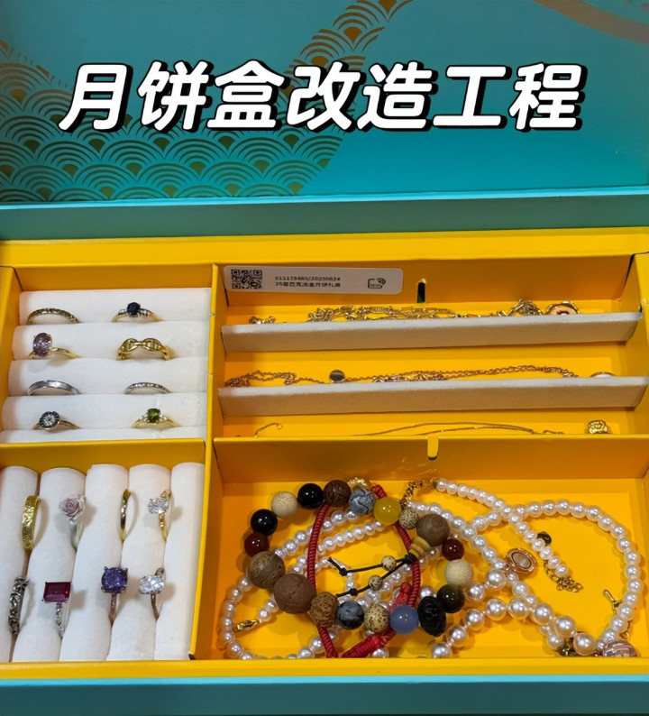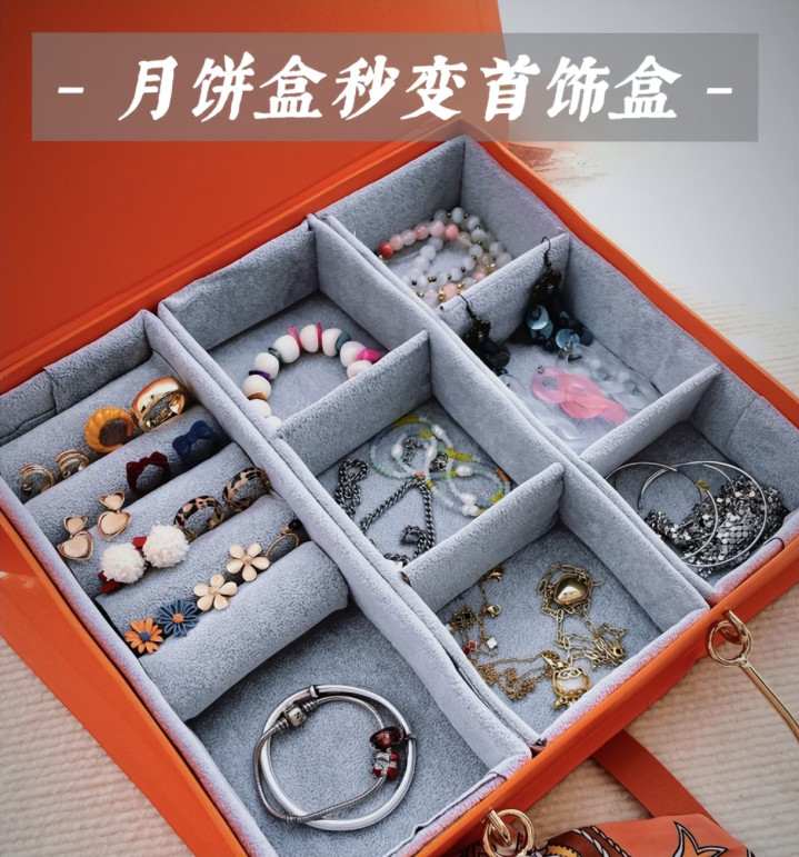放在月饼盒里面,可以用来收纳首饰:像是戒指啊、项链啊、耳钉啊,都可以放进去。