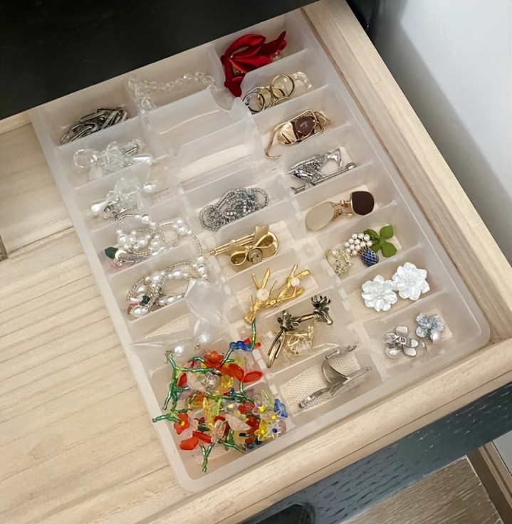 把这个饺子盒放进抽屉里面,再把首饰放进去,这不就是首饰盒吗?
