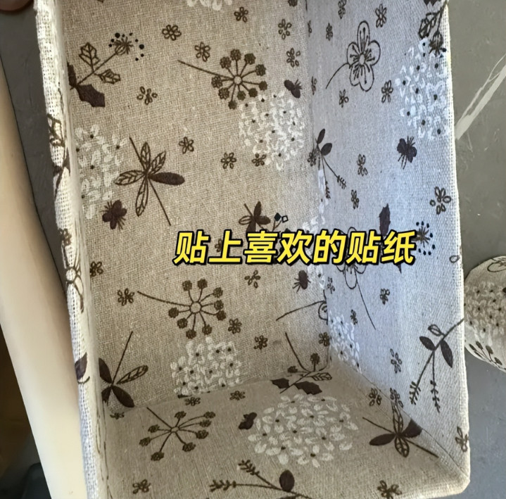 准备好好看的布,搭配着双面胶,把布料粘贴在盒子外面和里面。