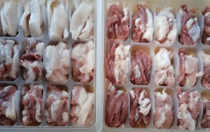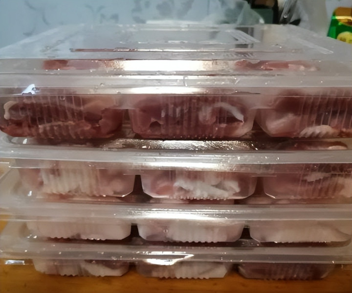 我婆婆会把猪肉切成一份份的,装进饺子盒子里面。