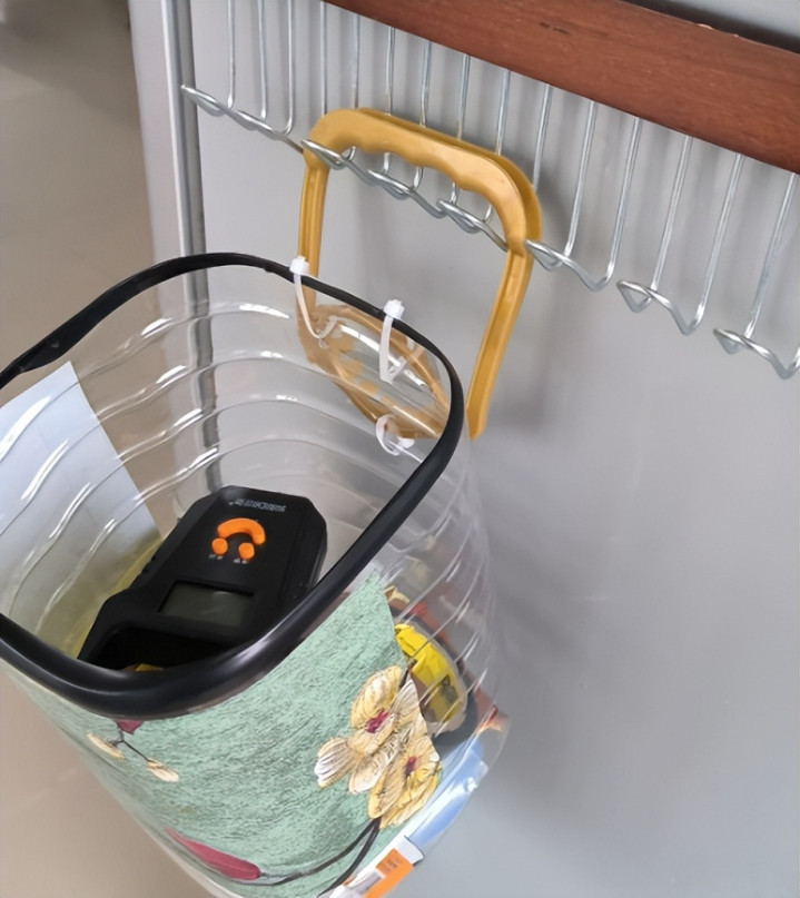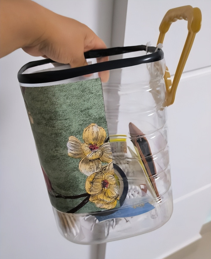把手固定在塑料桶上面,挂起来的话,可以用来装各种东西,这不就是一个收纳筐吗?